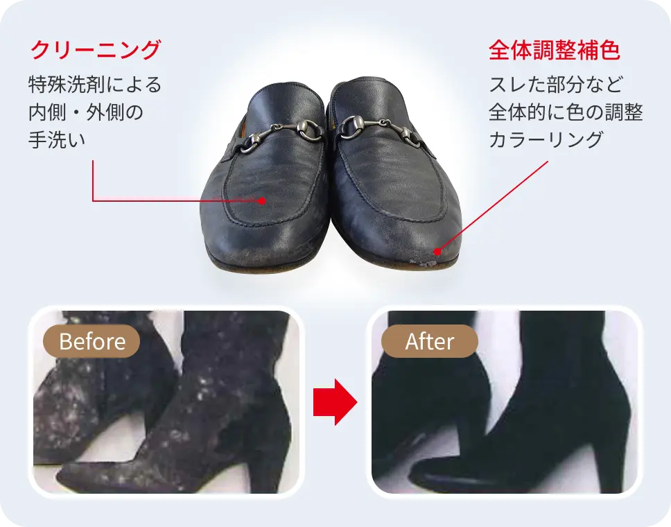 ブーツの中は湿度が70%以上になるため、近年女性を悩ませている水虫菌。丸洗いにより殺菌・消臭することができます。また、長く履いたブーツに発生したカビも、靴の洗浄によりきれいに復元。なめし革のビジネスシューズやカジュアルなスエードの靴もきれいに復元されます。